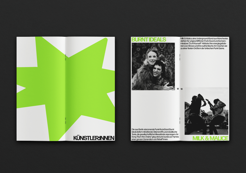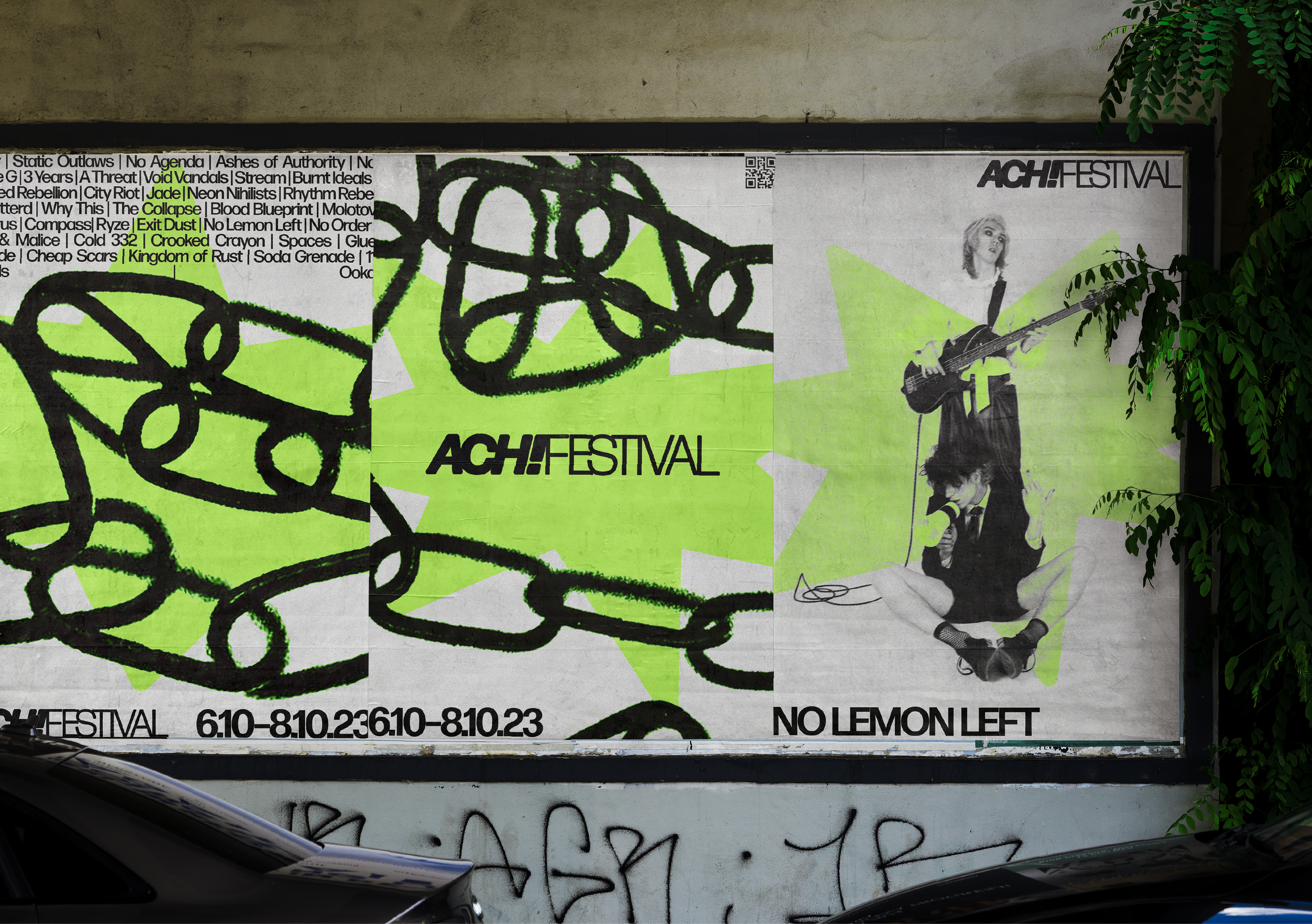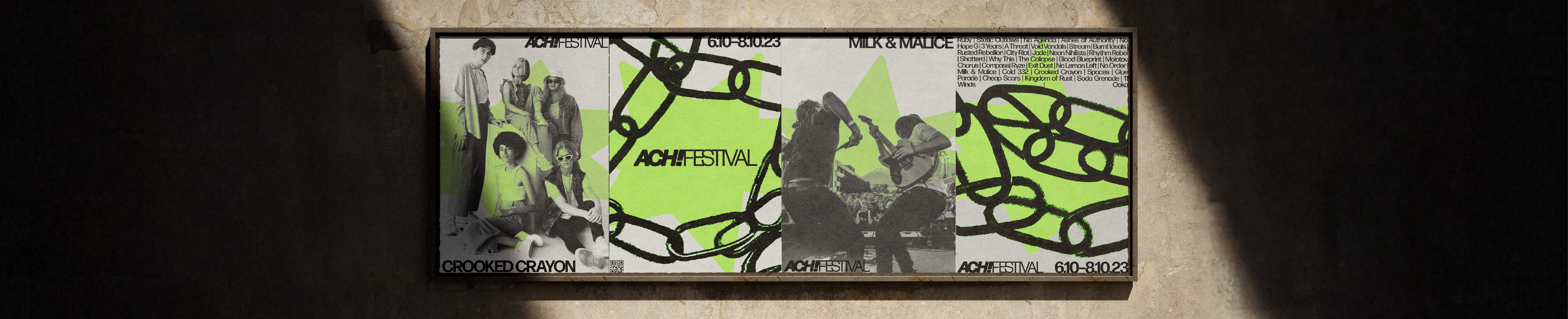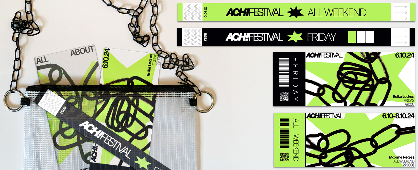Achfestival is a fictional Punk-Rock-Festival from Aachen, where rebellious sounds meet bold design. The festival’s visual identity embraces key elements of punk culture. At its core stands a always randomly generated star, a nod to the diversity of the scene, symbolizing the individuality of hairstyles, attitudes, and personalities that define punk.